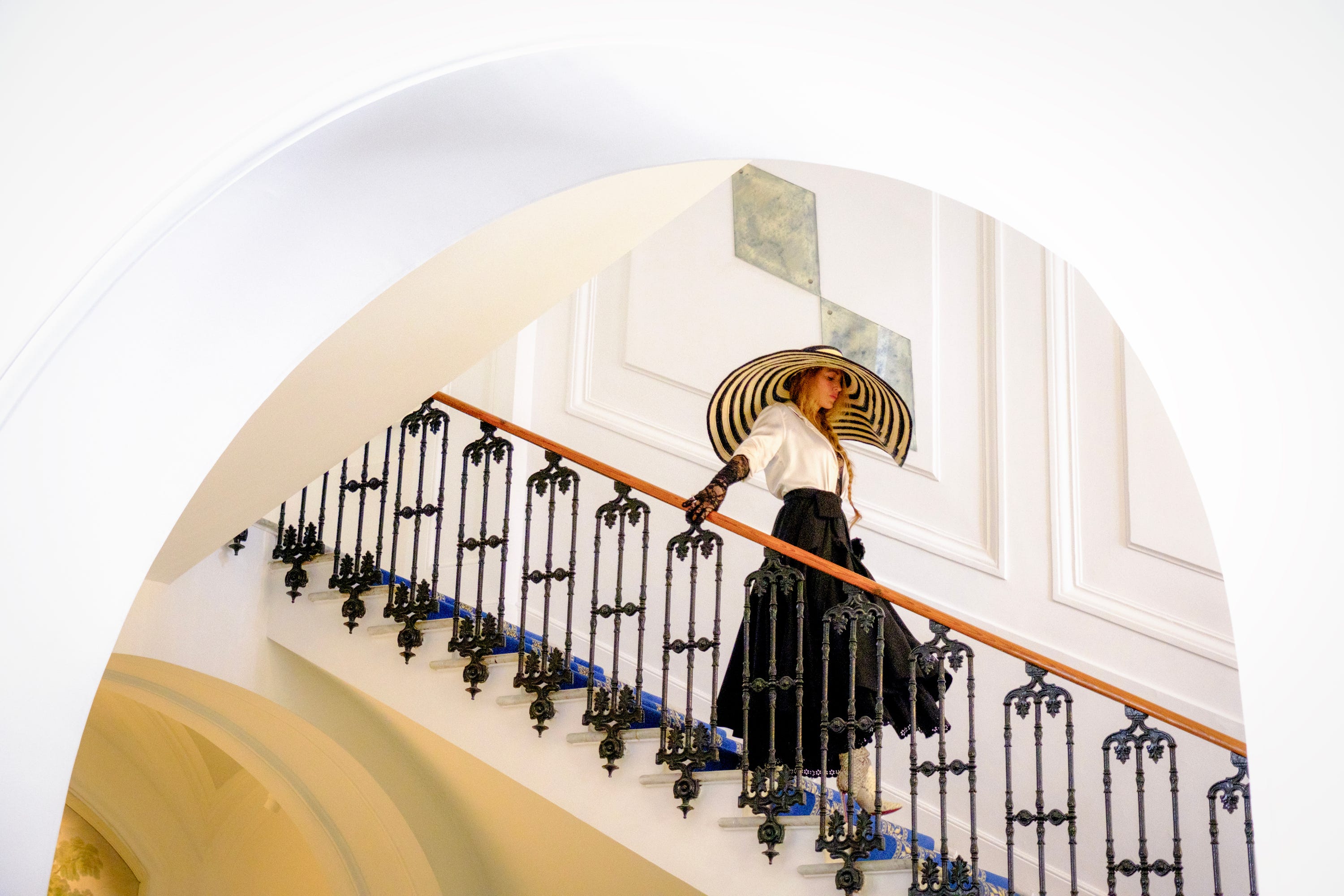 There was also plenty that movie buffs have never seen before, including Emily’s latex wedding gown with a mammoth train that ends in a blood-red hem. “ The size of the skirt of the wedding dress, it took a whole trailer to just house it,” Kalfus says. “The length of the veil was, like, blocks long. The silhouettes, the hat, the ways in which we fooled with [size], it’s almost like [Emily] took up all the space of the frame. This scale was so much fun.”